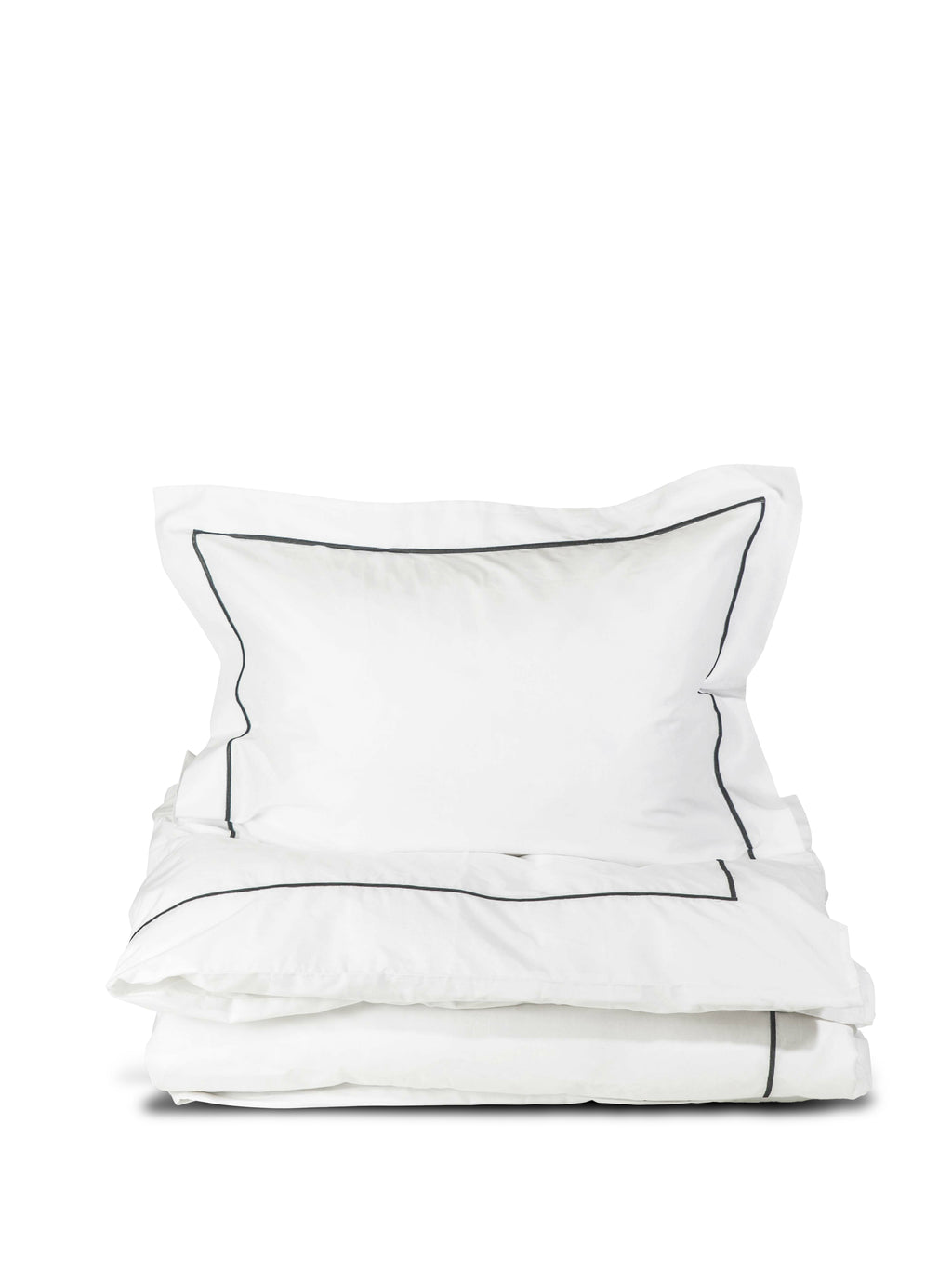 Låt hotellkänslan flytta hem. Carl påslakan och örngott är krispigt sköna. Carl är tillverkad i mjuk, 100% ekologisk bomull och bidrar definitivt till en god natts sömn. Designen är stilren och klassisk med en vit bas som pryds av svarta stygn, en sorts brodyr som kallas ”baratta”. Ett bäddset som håller i evighet, som är lika uppskattat att få som att ge bort. Säljs i set med påslakan och örngott. Finns i fler färger. Trådtäthet 144.