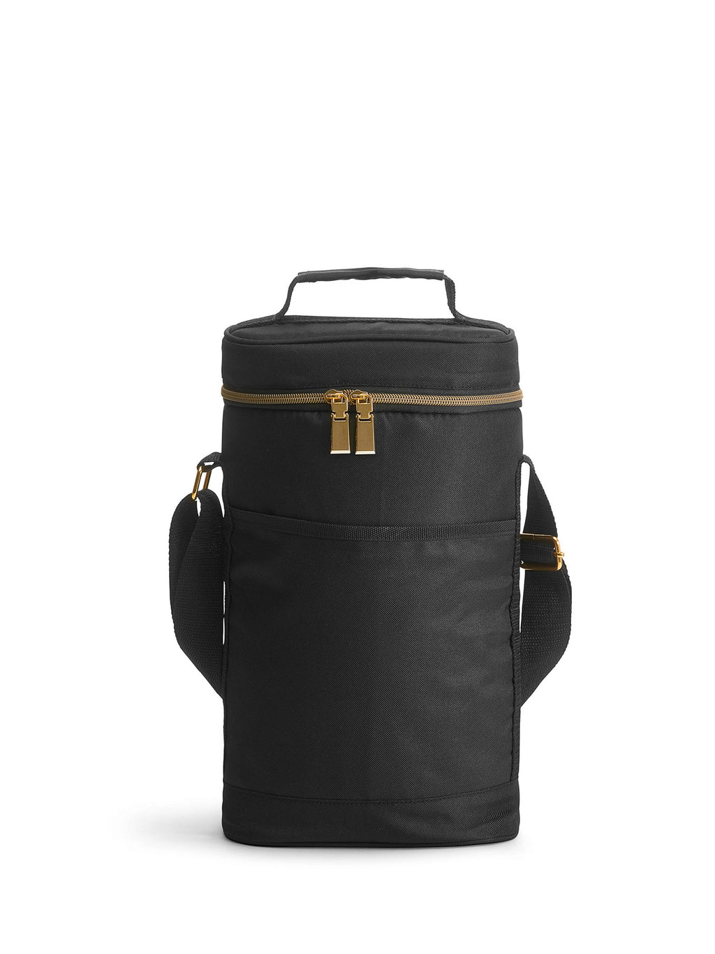 Praktiskt och snygg kylväska i svart med läckra detaljer i guld. En lite högre modell som passar tex till två vinflaskor eller 1,5 liter PET flaskor. Utrustad både med bärhandtag och justerbar axelrem.