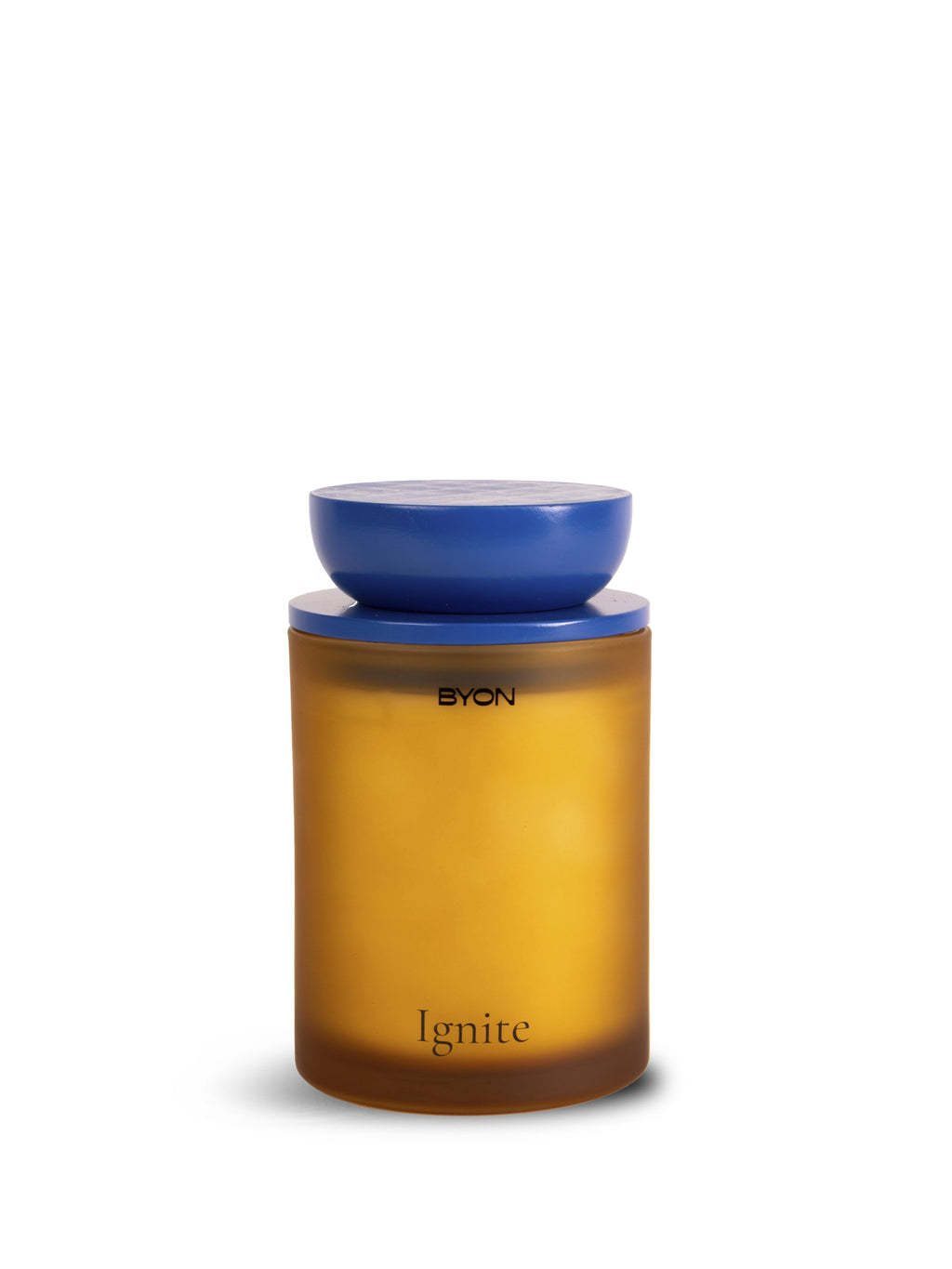 Inhyst i ett amberfärgat glas slutet med ett pampigt blått lock sprider Byons lyxiga rumsdoft Ignite en enastående atmosfär i hemmet, med dofter som speglar Byons inre rum. Doften ska framkalla trygghet och lycka toppat med en nyfikenhet så stark som endast Byon kan skapa och med en fängslande doft av imaginära blomnoter och tydlig tyngd av cederträ. Rumsdoften fångar essensen av hur Byon ska dofta, kännas och upplevas vilket speglas i en lekfull och glad design, som ska få alla rum att tända till och poppa ut. Doftljusen innehåller sojavax, doft samt vegetabilisk olja. Veke av bomull. Ljusen innehåller inget paraffin eller andra petrokemiska ämnen. För en bättre brinnupplevelse, trimma ljusveken före varje användning. Brinntid ca 55 timmar.