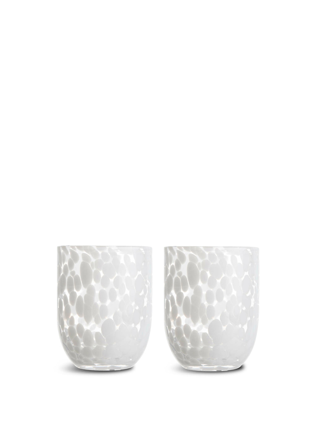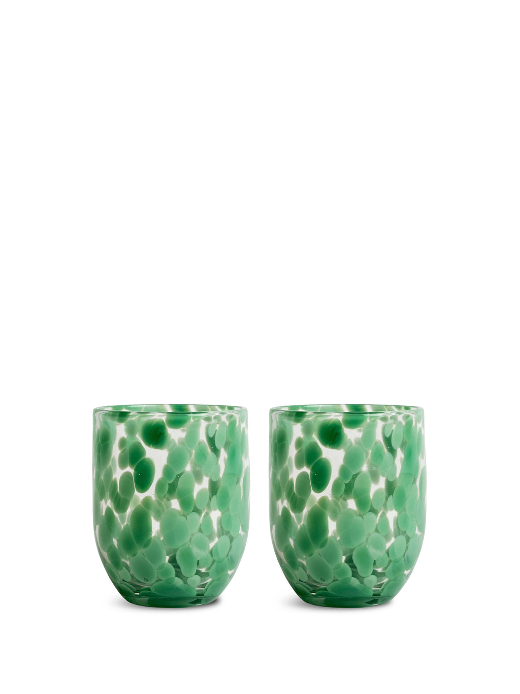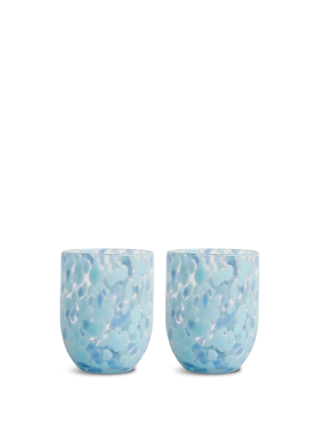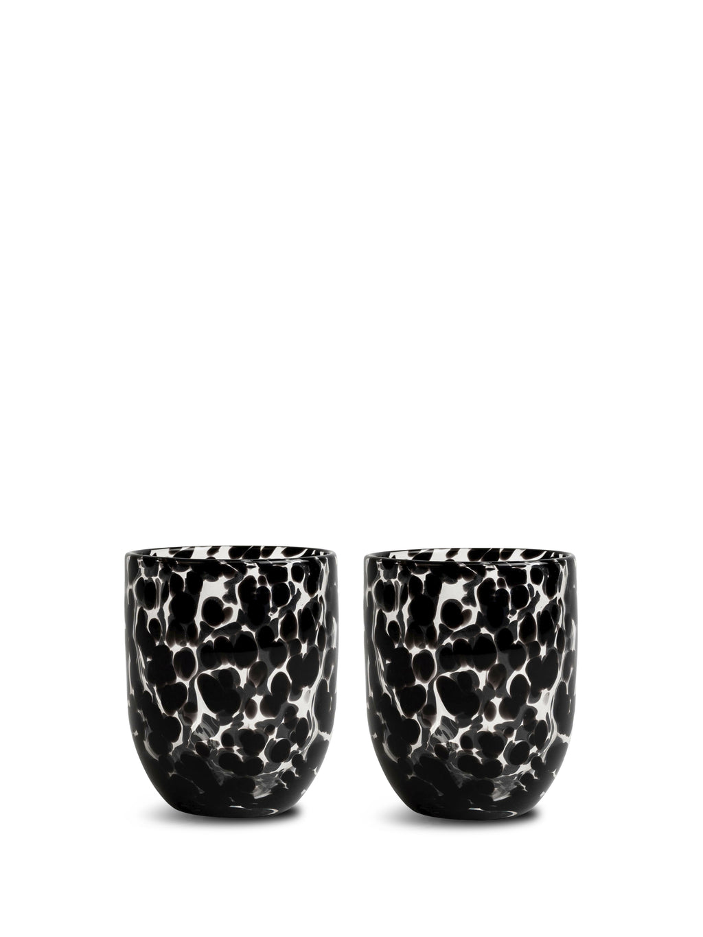 Som en smaskig lakritskaramell – söt, god och oemotståndlig. Tillverkad i handblåst glas med ett lekfullt konfettimönster av nattsvarta toner. Vi serverar drinkar, juice, mjölk eller kaffe. Det kan användas för värmeljus och badrummet piggas upp med ett fantastiskt tandborstglas. Handgjorda, färg- och strukturskillnader kan uppstå. Diskmaskinssäker. Design Byon Studio. Levereras i 2-pack i Byon box.