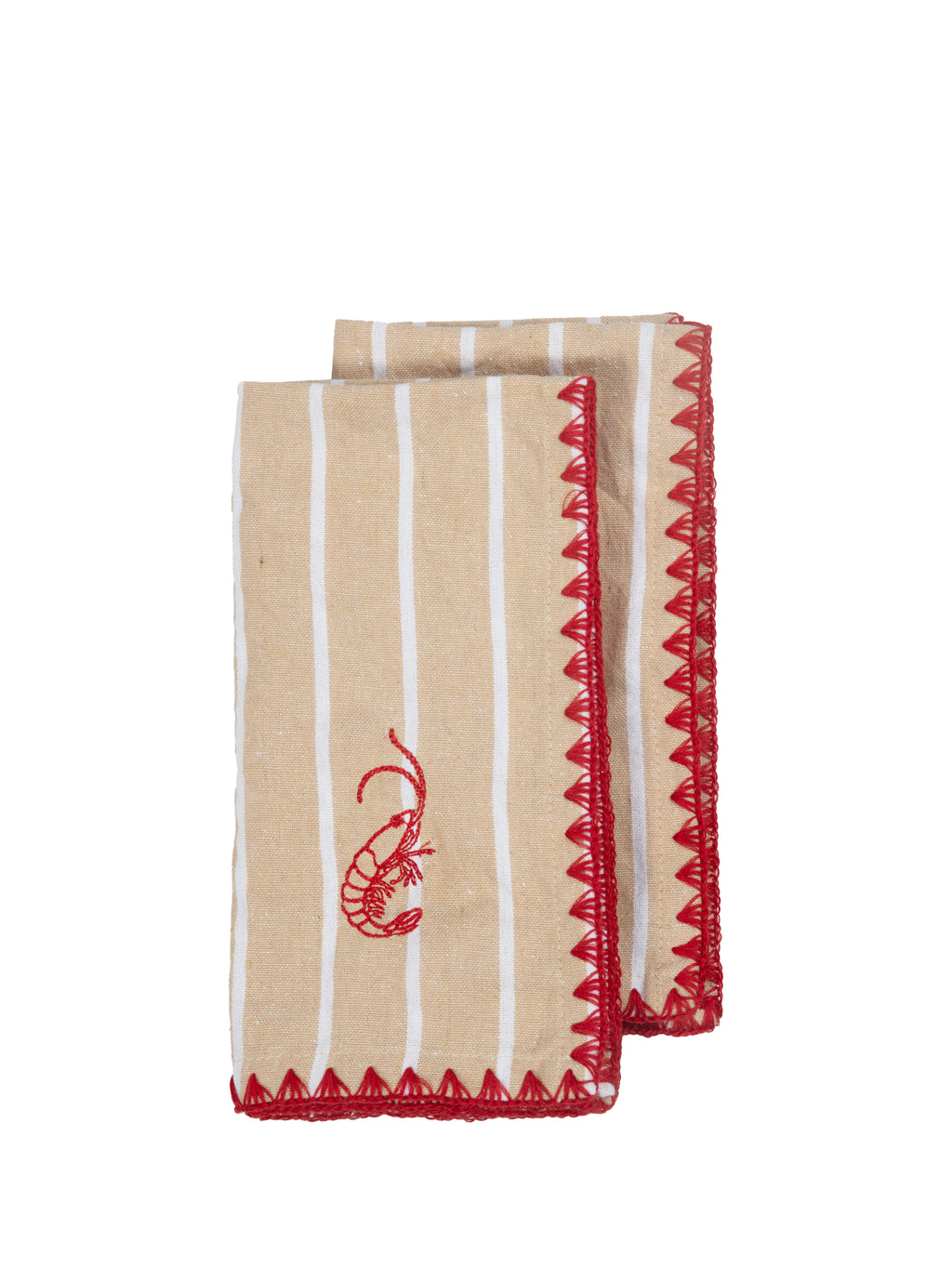Bubba kökshandduk har en tidlös rand i beige och vitt, tillsammans med en laskad kant och en röd kontrastkant för en elegant detalj. Den broderade räkan adderar en lekfull touch som gör varje köksstund lite roligare. Matcha med bordsduk och servetter från samma serie för ett enhetligt uttryck. Tillverkad i 70% återvunnen bomull och 30% återvunnen polyester. Mått: 50x70 cm. Levereras i 2-pack, med ett band och rosett. Design Byon Studio.