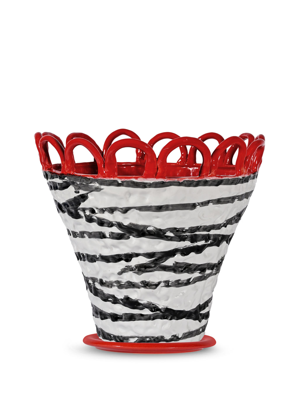 Patty är en djärv och lekfull kruka som personifierar Byons anda mer än något annat. När Emma skulle skapa en kollektion för Byon föll valet naturligt på hennes signatur – zebran och det randiga mönstret – för att göra ett starkt statement i hemmet. Zebramönster och poppiga glasyrer har länge varit en del av Emmas konstnärskap, och i Patty förenas de i en uttrycksfull kombination av två världar. Krukan levereras med ett fat och är utrustat med dräneringshål, vilket gör den både praktisk och dekorativ. Krukan är handgjord och tillverkad i stengods och finns i fler färgställningar och storlekar. Handgjord. Färg- och strukturskillnader kan uppstå. Alla krukor är unika. Design Byon x Emma Widell. Levereras i Byon box.