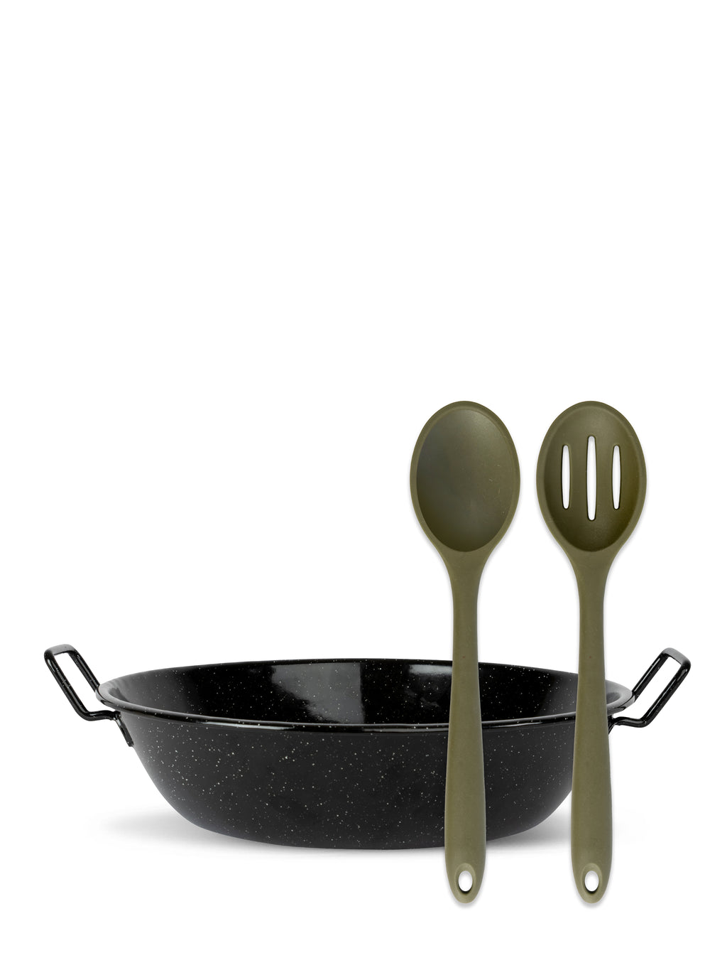 OBS! Kit packas mot kundorder, därav att lagersaldo anges till 0. Att laga mat utomhus är inte längre en trend, det har blivit en självklarhet för alla som tillbringar tid i skog och mark. Doris panna är en del av Sagaforms emaljserie och lämpar sig till allt från paella, wok, grönsaker eller soppa, allt som du vill tillaga över öppen eld. Pannan är tillverkad i emaljerat kolstål med en mycket slitstark yta. Använd inte vassa föremål som kan skada emaljen. Kolstål går snabbt att värma upp och har dessutom något lättare vikt, medan emaljeringen skyddar från rost. Doris panna finns i två storlekar. En favorit för alla som lever ett aktivt liv! Pannan fungerar också utmärkt i ugn, på grillen och induktion upp till 225grader. I detta kit ingår Doris emaljpanna medium 5018416 och Daniel serveringsredskap, 2-pack, grön 5018578.