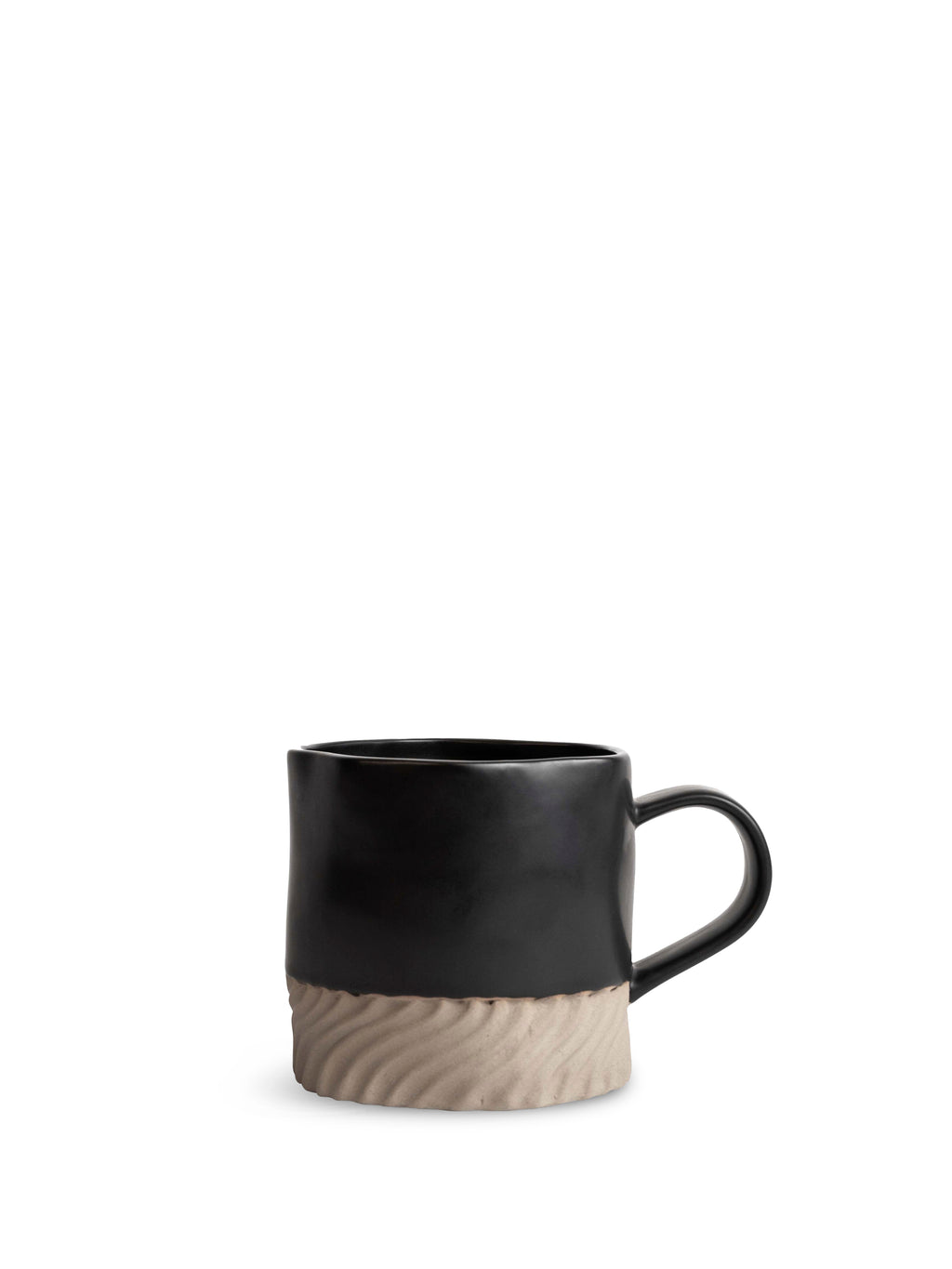 Oregelbunden, rund, snirklig, organisk, överdimensionerad och med sneda stökiga ränder. Den enda koppen som gör allt fel och därför blir 100% rätt. Mugg Swirl andas Byon i varje detalj. Färgen är mattsvart i kombination med naturlig ton av lera.