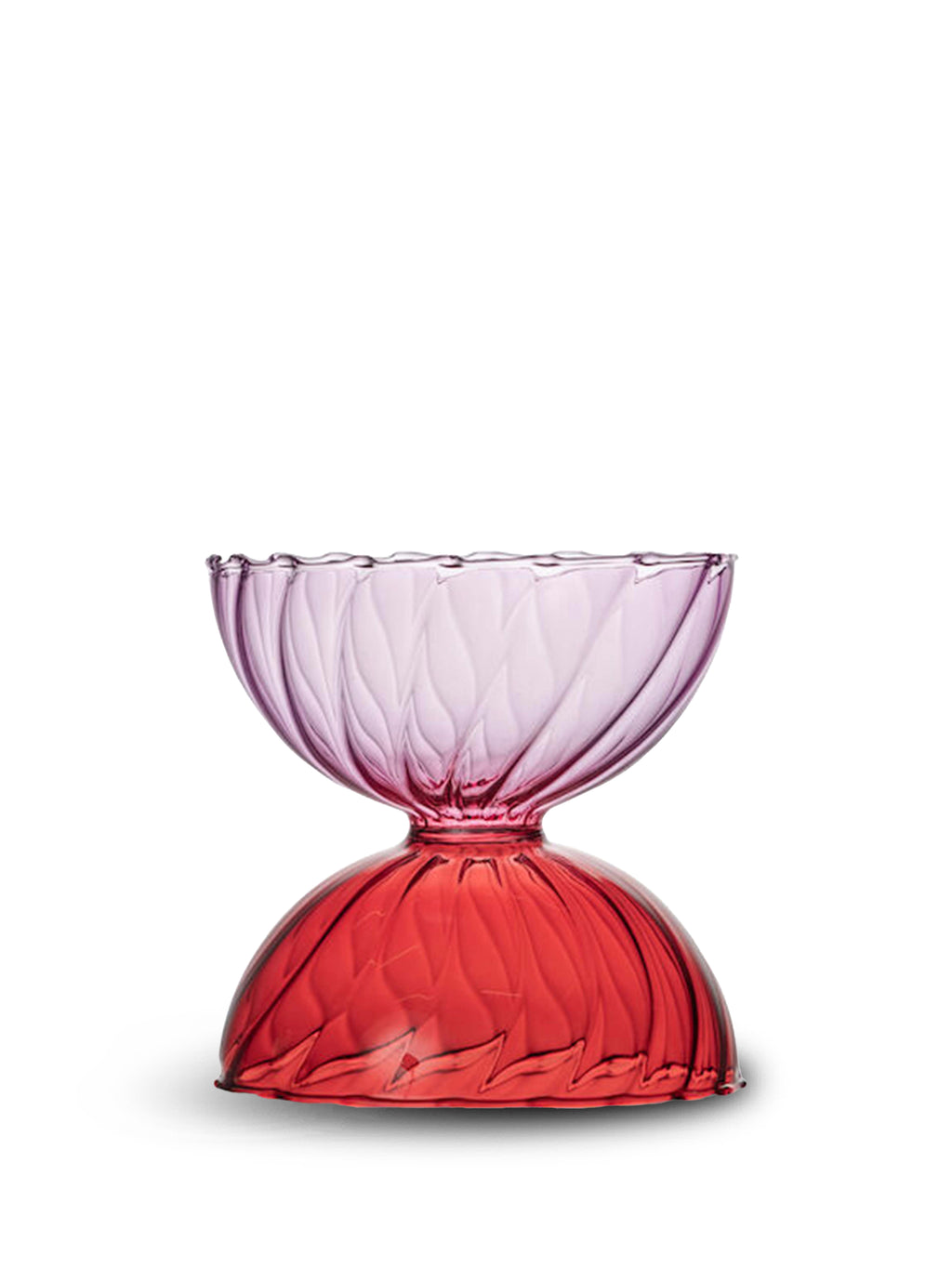 En liten skål i färgat glas. Ränderna i glaset ger liv, och mötet mellan de rosa och röda tonerna gör skålen retrotrendig. En färgklick likt en lollipop!