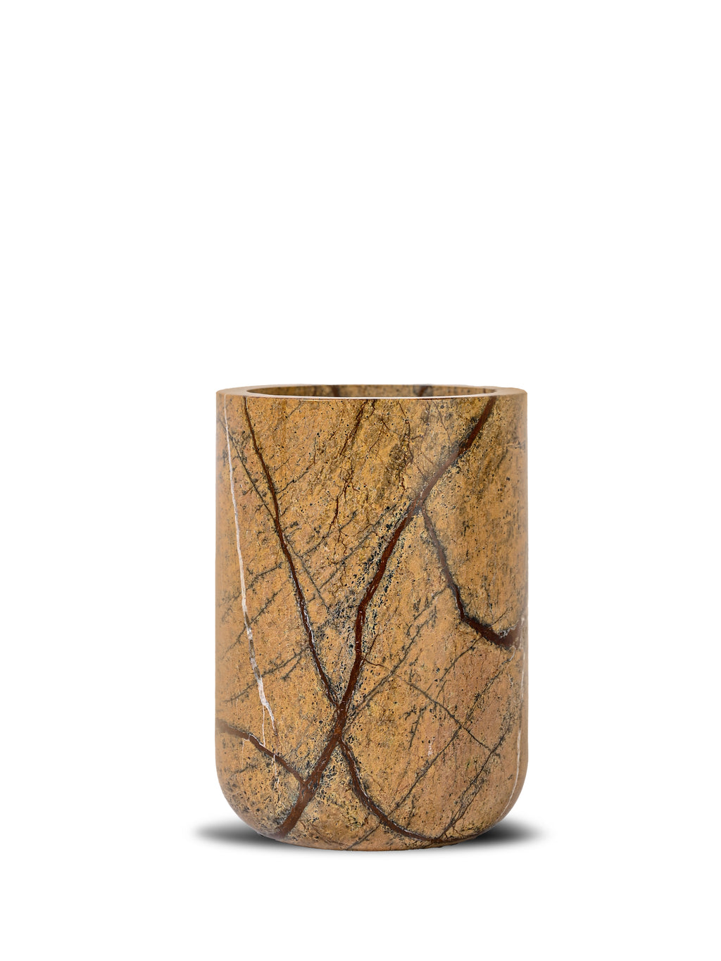 Stilren och naturnära, nedtonad och sobert lyxig! Sten vinkylare har en rak form med rundad botten. Materialet, brun skogsmarmor, är tungt och gediget med oregelbundna mönster som liknar naturens egna inslag. Tillsammans blir det en vinkylare med en stark och naturlig look. Lägg is i botten eller frys ner den ett par timmar för att hålla vinet kallt. Sten vinkylare är designad för att vara tidlös – form och material går aldrig ur tiden. Ett hållbart tips är att använda vinkylaren som vas när den inte kyler eller serverar drycker! Design Studio Sagaform. Levereras i en klassisk presentbox. Livsmedelssäker.