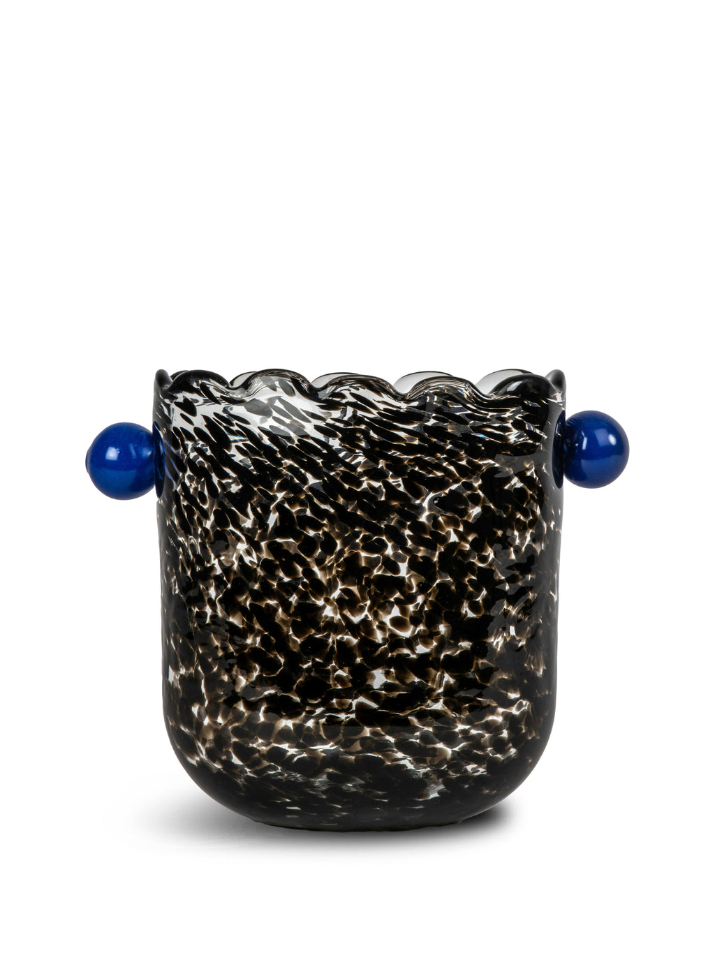 Serien Messy är både lekfull och rolig att servera i. Den bjuder in till kreativa drycker och ett busigt humör. Vasen, vinkylaren eller bålskålen Messy är inte sämre än sina familjemedlemmar och levererar flertalet användningsområden, endast din fantasi sätter gränser. Formen är oval för att passa in överallt och pryds av två pigga och runda handtag i powerblått. Det tjocka glaset är handgjort och munblåst i svarta och klara toner. Alla är unika, precis som du. Färg- och strukturskillnader kan uppstå. Diskmaskinssäker. Design Byon Studio.